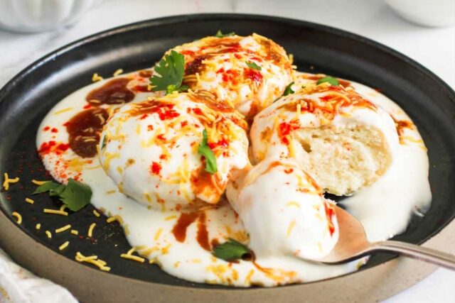 अब दही वड़े का पानी हल्के हाथों से दबाकर निकाल दें. अब वड़े के ऊपर दही को डाल दें. इसके ऊपर हरी चटनी और इमली की चटनी को भी डालें. अब बारीक कटा हुआ धनिया से इसे सजाएं.