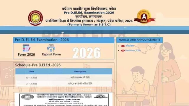 वर्धमान महावीर खुला विश्वविद्यालय कोटा ने शैक्षणिक सत्र 2026-27 के लिए राजस्थान प्री डीएलएड परीक्षा 2026 के लिए आवदेन की प्रक्रिया शुरू कर दी है। डीएलएड करना चाह रहे विद्यार्थी predeledraj2026.com पर जाकर एप्लाई कर सकते हैं। आवेदन की अंतिम तिथि 31 दिसंबर 2026 है। परीक्षा तिथि बाद में घोषित होगी। प्रदेश में 376 से ज्यादा डीएलएड कॉलेजों की करीब 26 हजार सीटों पर प्रवेश के लिए यह परीक्षा होगी। प्रारंभिक शिक्षा में अध्यापक बनने के लिए आवश्यक दो साल के अध्यापक शिक्षा पाठ्यक्रम डीएलएड में प्रवेश के लिए यह परीक्षा होती है। थर्ड ग्रेड शिक्षक भर्ती लेवल वन टीचर के लिए दो वर्षीय डीएलएड कोर्स करना अनिवार्य है। पिछले साल 5 लाख से ज्यादा ने फॉर्म भरा था। इसमें 70 फीसदी महिलाएं थीं।