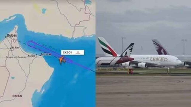 अमेरिका और ईरान में जारी जंग के बीच एक विमान हादसे का शिकार होने से बाल-बाल बच गया। जानकारी के मुताबिक मुंबई से दुबई के लिए उड़ान भरने वाली इस फ्लाइट को रास्ते में अचानक मिसाइल का अलर्ट मिला, जिसके बाद एक अप्रत्याशित कदम उठाना पड़ा। मिसाइल हमले का अलर्ट मिलने के तुरंत बाद एमिरेट्स के विमान को UAE एयरस्पेस में रेयर गतिविधि करते देखा गया। Flightradar24 के डेटा के मुताबिक EK501 नाम का विमान मंगलवार सुबह UAE एयरस्पेस के बाहर रोक दिया गया। रक्षा मंत्रालय ने अलर्ट भेजा कि देश के एयर डिफेंस ईरान की तरफ से लॉन्च की गई बैलिस्टिक मिसाइलों का जवाब दे रहे हैं और विमान को खतरा हो सकता है। इसके बाद लाइव प्लेन ट्रैकर के मुताबिक विमान को दुबई में लैंड करने से पहले डबल रिवर्स करते देखा गया, जिसे बेहद ‘दुर्लभ’ कदम बताया जा रहा है। फ्लाइट को पहले मुंबई वापस जाते देखा गया था। हालांकि बाद में अधिकारियों द्वारा रोके जाने से पहले विमान वापस दुबई की ओर जाने लगी।